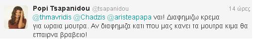 Στο πλαίσιο συζήτησης και ανταλλαγής σχολίων με άλλους χρήστες του Twitter, η Πόπη Τσαπανίδου έγραψε: